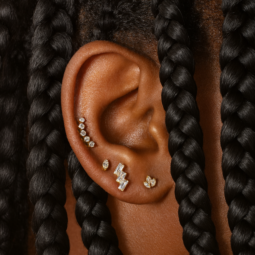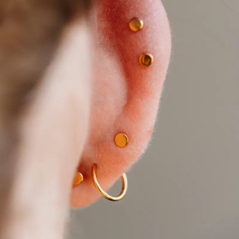 These earrings work in both lobe and cartilage piercings. They are hypoallergenic and 100% nickel-free, so you don't have to worry about irritated skin. They are the perfect addition to your ear stack.