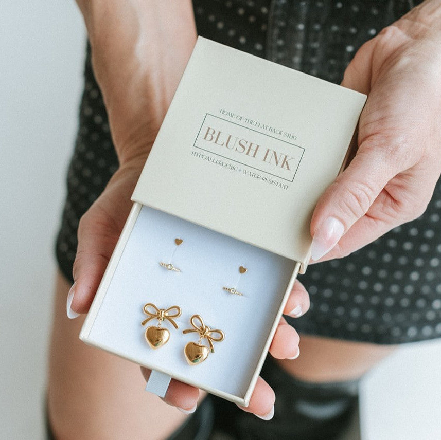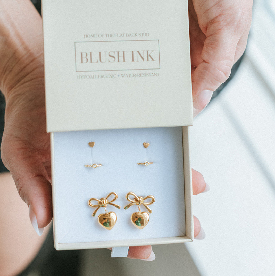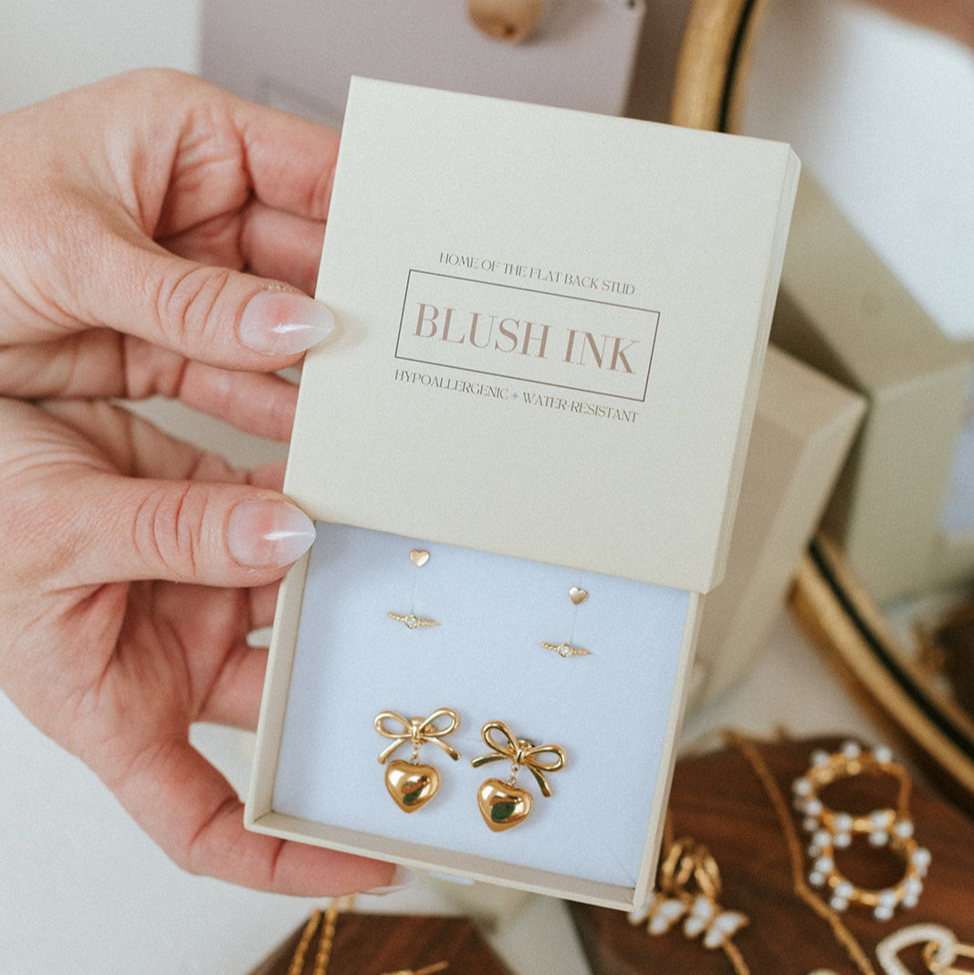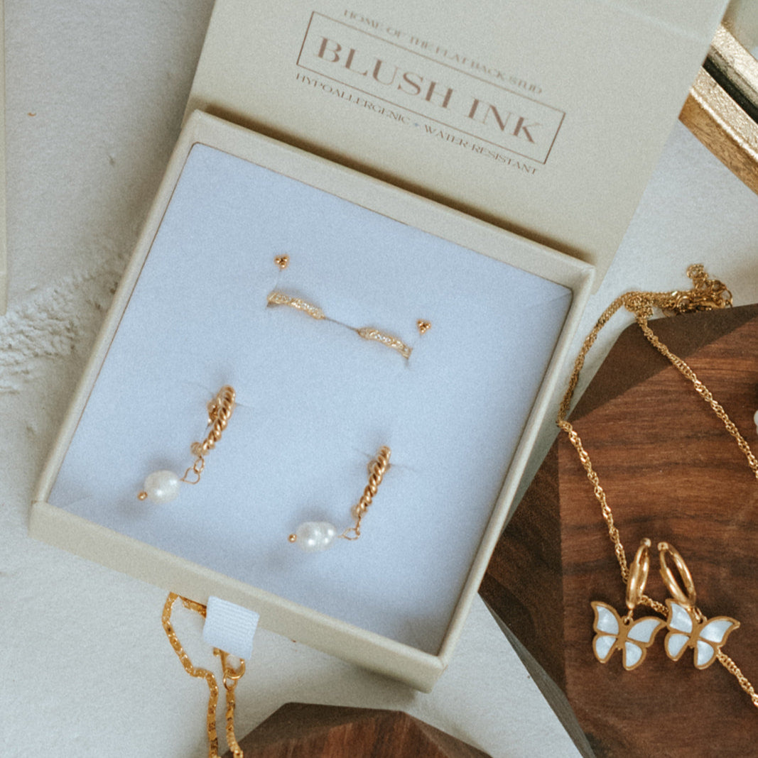 Introducing our Stack of the Month earring subscription—your go-to for effortlessly curated ear candy! Each month, you’ll receive a stunning trio: one pair of dangle earrings, one pair of hoops, and one pair of threadless flatback earrings, perfect for stacking and mixing up your look. All of our jewelry is hypoallergenic and water-resistant, so you can wear your pieces comfortably and confidently every day. Designed to keep your style fresh and versatile, this subscription is ideal for anyone who loves switching up their ear game with ease. Valued at $115, you’ll get this gorgeous set each month for just $75—making it the perfect way to treat yourself while saving big.